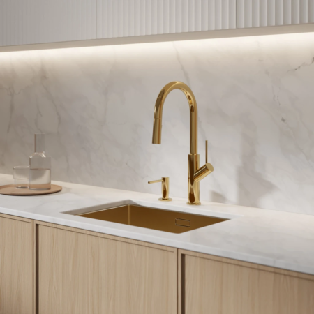 波蘭 OMNIRES BEND Series|亮面金 可拉式廚房龍頭 BE6455GL