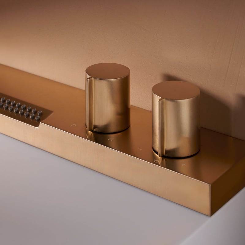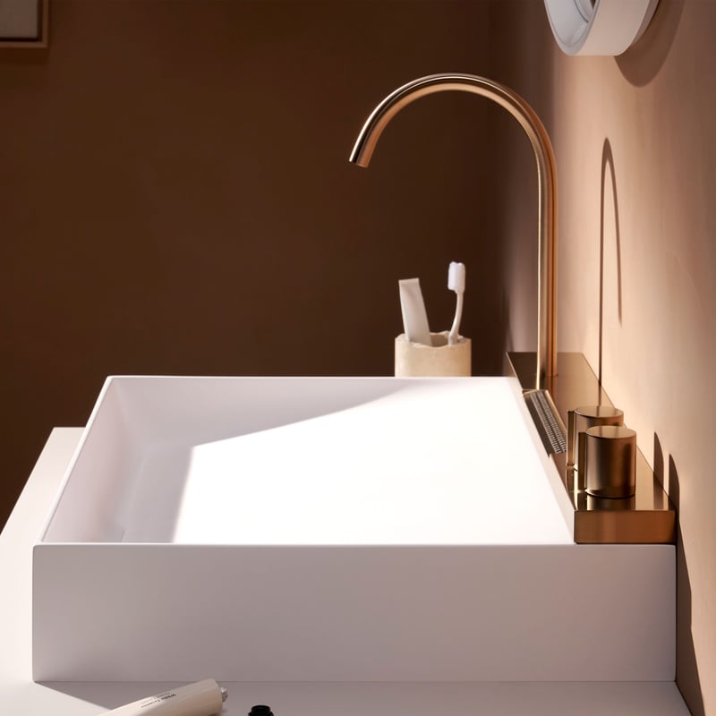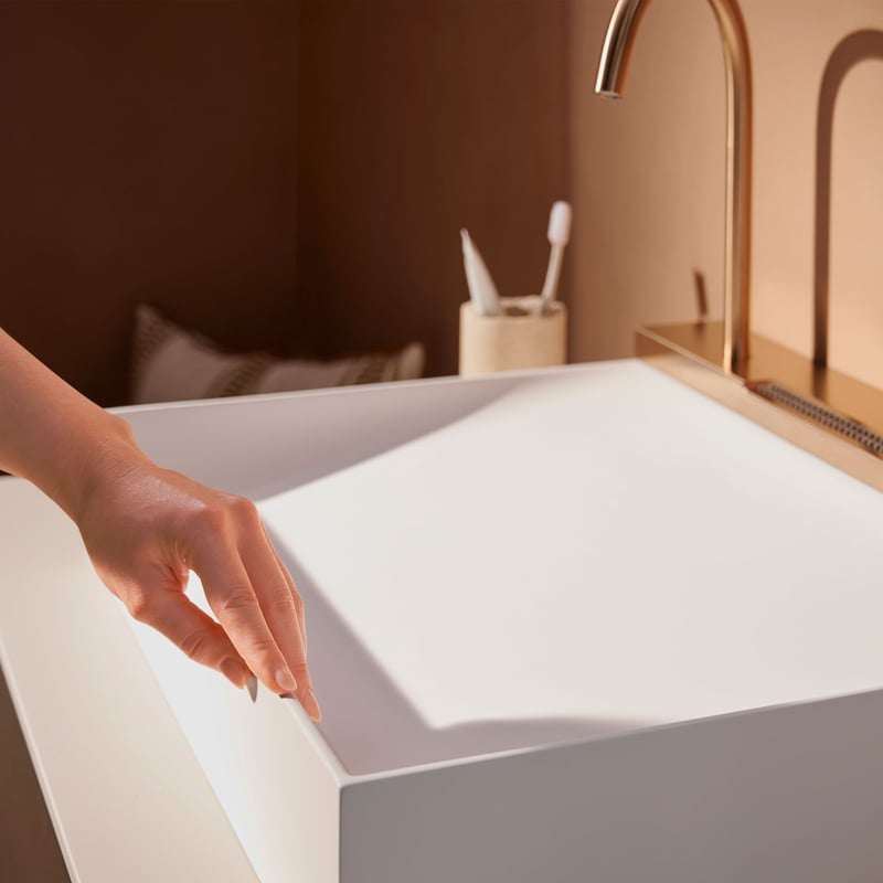 拉絲青銅 × SolidSurface 有溫度的現代美學 極致的奢華,是將複雜的控溫結構完全隱藏於幾何美感之中。 Avalegra 採用霧面白色人造石打造寬達 58 公分的洗面盆,觸感細膩如絲。搭配德國精工拉絲處理的青銅色出水管與恆溫面板,在純白啞光盆體與溫潤金屬飾面之間,創造出極具張力的設計層次感。這抹青銅色澤能完美對應木質調、石材或是帶有大地色系的室內空間,展現極高雅的品味。