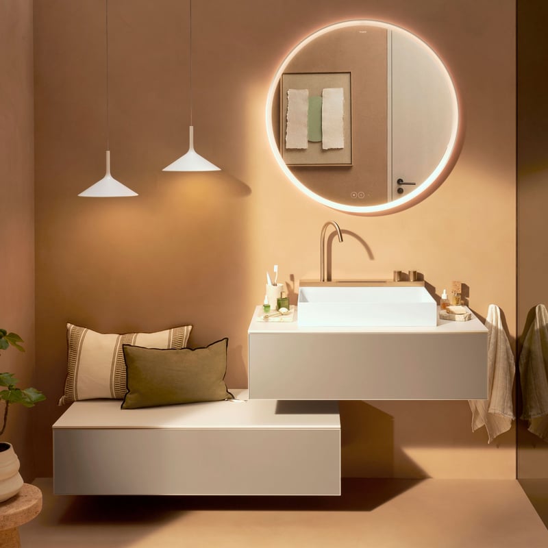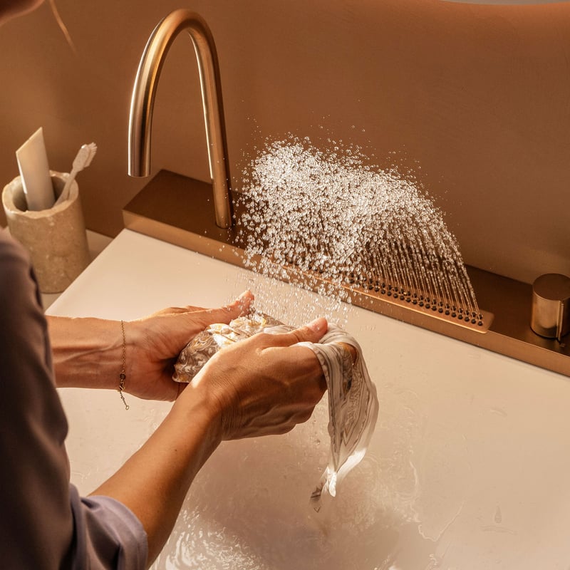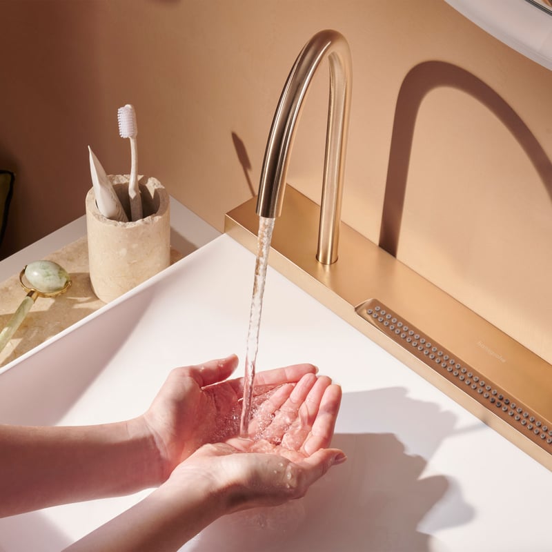 雙重水流切換.洗臉也是一種奢華儀式 面盆的用水,不該只有一種表情。 高挑的 ComfortZone 220 出水設計提供極佳的操作餘裕,並具備 60 度可旋轉功能。透過面板直覺切換:您可以選擇清澈無噴濺的 LaminarSpray(層流)進行快速盥洗;或是啟動如微雨般細緻的 Rain(雨淋)模式。細密的雨淋水幕溫柔包覆雙手,讓洗臉過程從例行公事昇華為 SPA 等級的感官體驗。