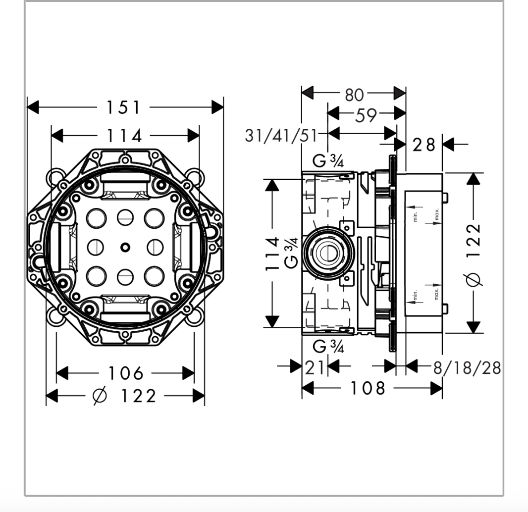 iBox壁埋式管線盒,適用於Hansgrohe所有基本埋壁安裝的淋浴、浴缸和恆溫器套件