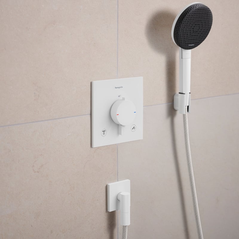 完整套件: 內含 Raindance Select S 120 手持花灑、Unica 淋浴滑桿 (可調整高度與角度) 以及 Isiflex 防纏繞軟管。值得一提的是,連軟管也是霧面白配色,視覺效果極度統一。