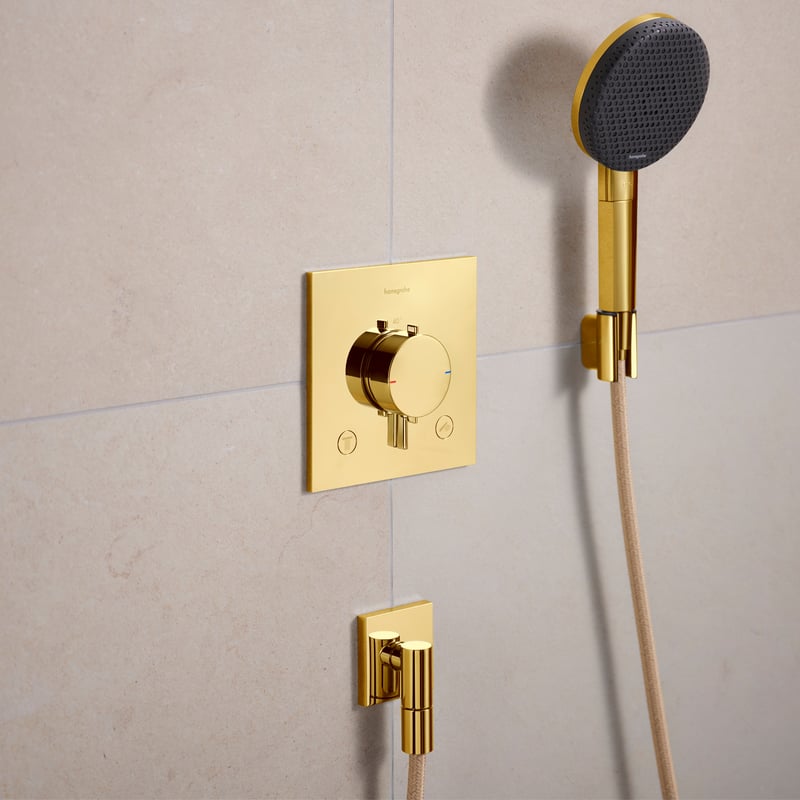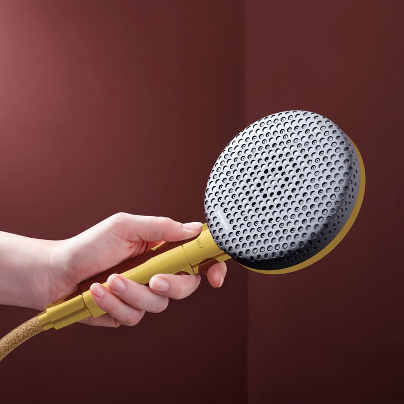 亮面金: 這不是普通的金色噴漆。hansgrohe 採用航太級的 PVD (物理氣相沈積) 技術,將金屬鈦離子與表面緊密結合。它呈現出如真實黃金般的深邃光澤,且硬度極高、抗刮耐磨、永不褪色。在浴室暖光的照射下,整支蓮蓬頭閃閃發光,展現極致的貴氣。