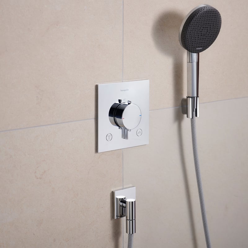 Hansgrohe 的鍍鉻層厚實平整,擁有如鏡面般的亮度。它能反射光線,讓狹小的淋浴間看起來更明亮、更乾淨。