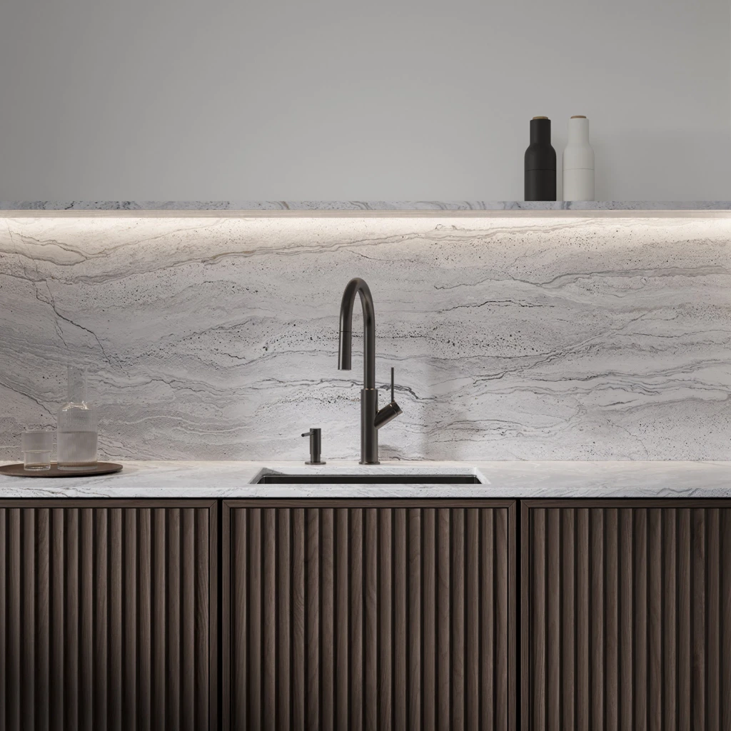 它以深邃霧灰的姿態,詮釋廚房的現代靜奢之美。