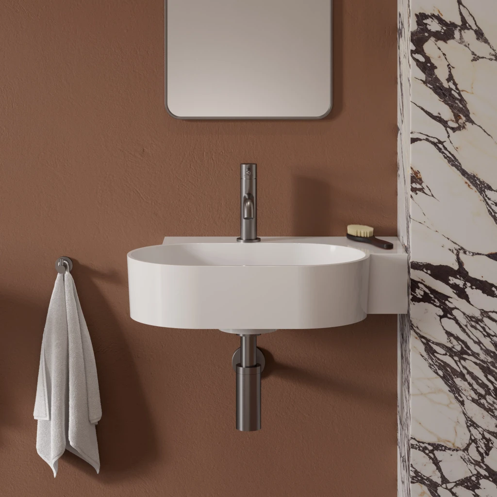 幾何的平衡:兩個相對的半圓構成飽滿的盆體,與右側理性的矩形平台形成「圓潤 × 俐落」的完美平衡。