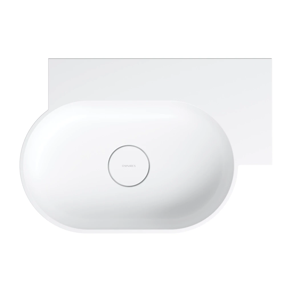 幾何的平衡:兩個相對的半圓構成飽滿的盆體,與右側理性的矩形平台形成「圓潤 × 俐落」的完美平衡。