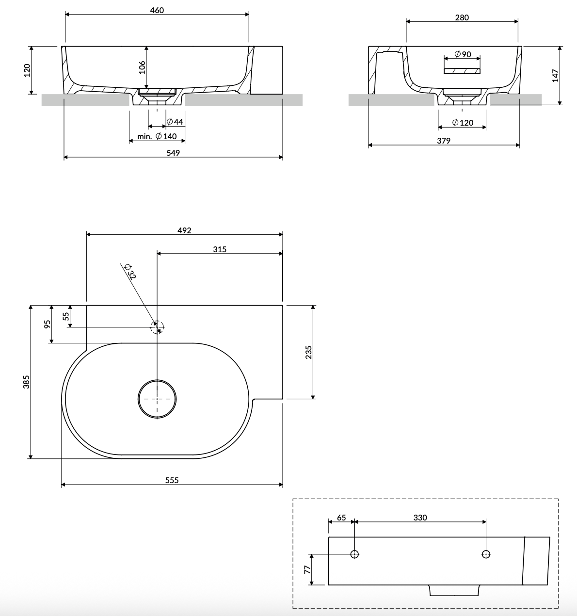 檯上安裝時,只需在檯面預先開一個 直徑 140 mm 的圓孔,